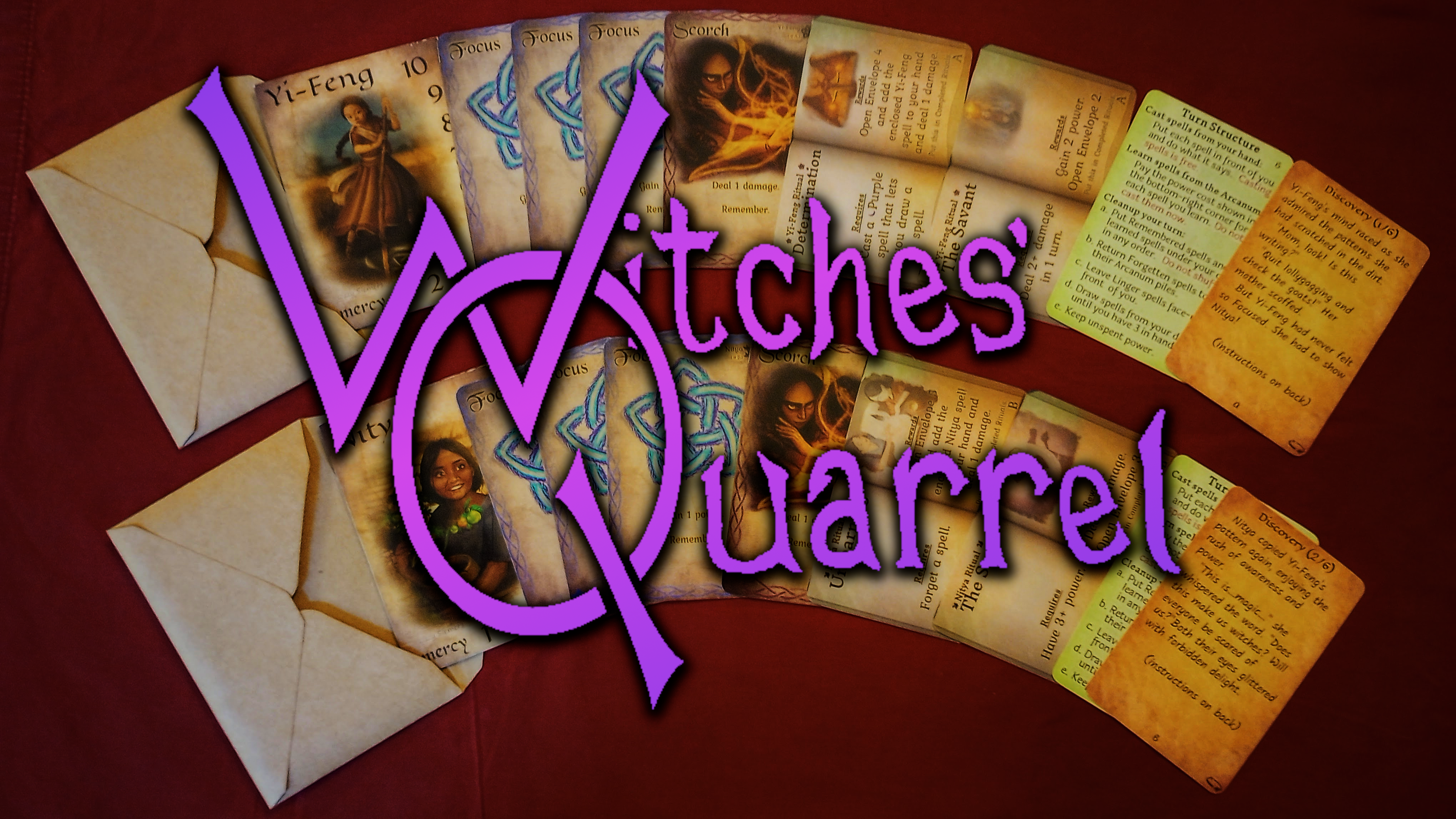 Witches' Quarrel is a 2 player, 10-20 minute legacy deckbuilding duel, where children learn magic by attacking each other with spells.